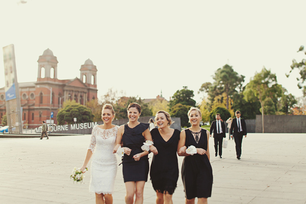 this is a fun set of wedding photos: julia's dress is what caught my eye in this wedding post on snippet & ink--arms linked with her girls clad in black--classy and fun. julia and james are ridiculously lovey-dovey cute in their surprised and excited expression--i imagine that's right after they said "i do." ta-ha. and you have to end with a good solid hug and kiss.